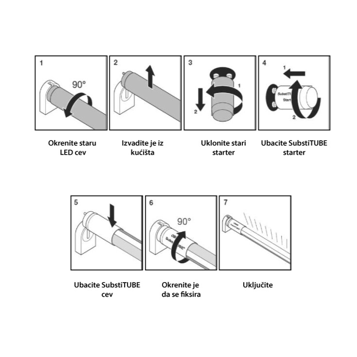 Ovaj tip cevi koristi kratkospojivi starter, koji se stavlja umesto postojećeg da bi LED cev radila (u sklopu isporuke)