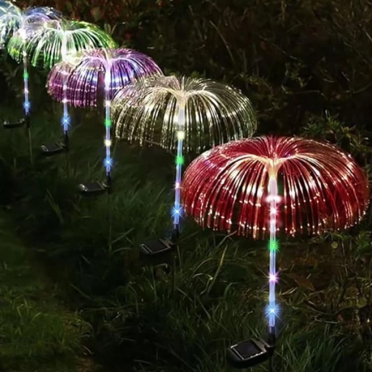 Set od dve solarne baštenske lampe u obliku meduze, stvaraju magičan svetlosni efekat uz pomoć savitljivih optičkih vlakana i višebojnog LED osvetljenja