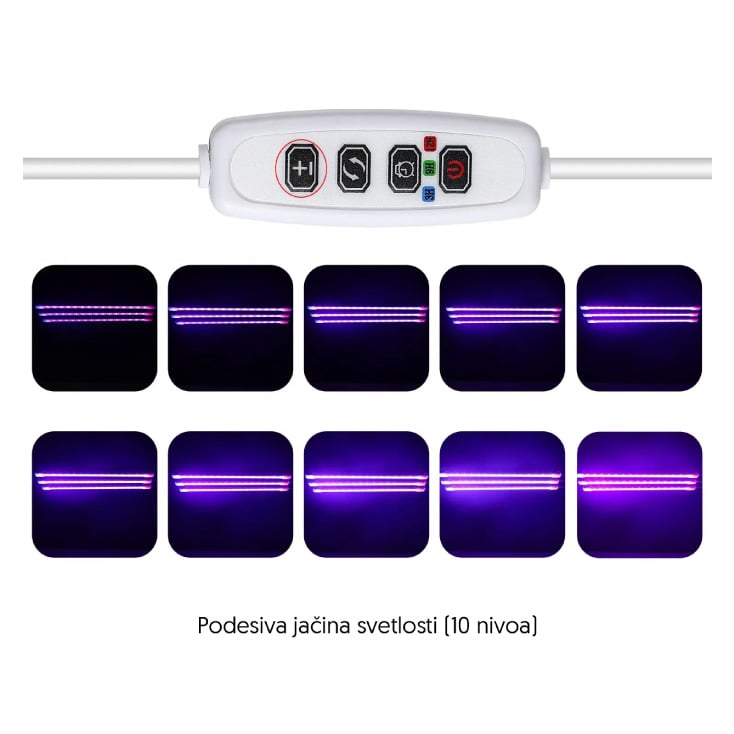 Tajmer omogućava precizno postavljanje svetlosti bez brige o isključivanju, dok 10 nivoa jačine omogućava da svaka biljka dobije upravo onoliko svetla koliko joj treba